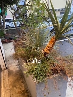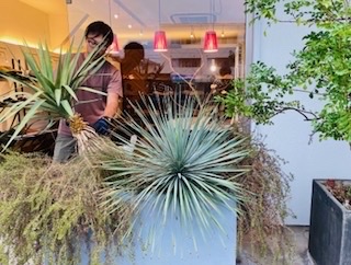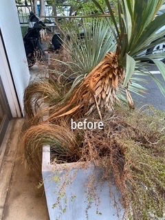昨日の閉店後、外の植木がだいぶ枯れてしまったので剪定をYard Waorksさんにお願いいたしました。