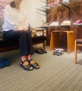 これからのシーズンに向けてサンダルをお探しにお越しいただきました顧客様。今回は、エナメル素材の『LUXOR』をお選びいただきました。足首と甲のマジックベルトで足をしっかりホールドするので、長時間の歩行でも疲れず快適にお履きできる人気のサンダルになります。エナメル素材もより足元を引き立てます。