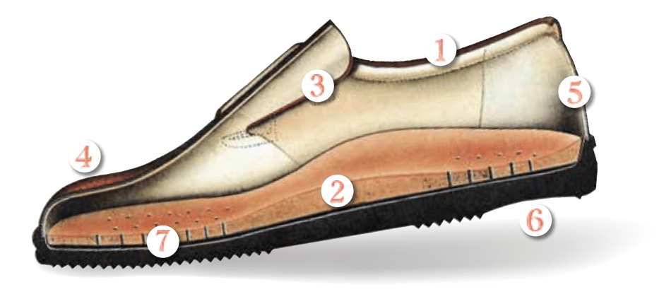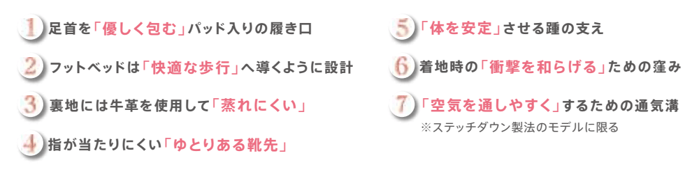 靴型には足の形に沿う木型を使用し、前足部にはゆったりと余裕を持たせ、足に優しい機能を備えました。さらに、素材には強くしなやかな牛革を使用。アウトソール(本底)には、歩行時の衝撃を吸収する、軽くて柔らかく丈夫なポリウレタン製ソールを使用しています(一部の商品を除く)。