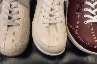 向かって左から、トーププリント、ラテ/ゴールドプリント、ボルドーとなります。横幅が広く、甲が高い方にお薦めの一足となります。個人的には、年間通じてお洋服に合わせやすくお履きいただけそうなトーププリント(グレー)はお薦めです。展示は16日までとなりますので、是非店頭にてお試しください。