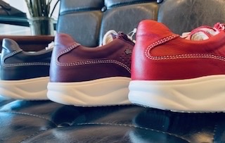 向かって左から、ダークブルー、ヴィオラ、レッドとなります。通気性もよく足がむれやすい方、横幅が広く、甲が高い方にお薦めの一足となります。展示は16日までとなります。